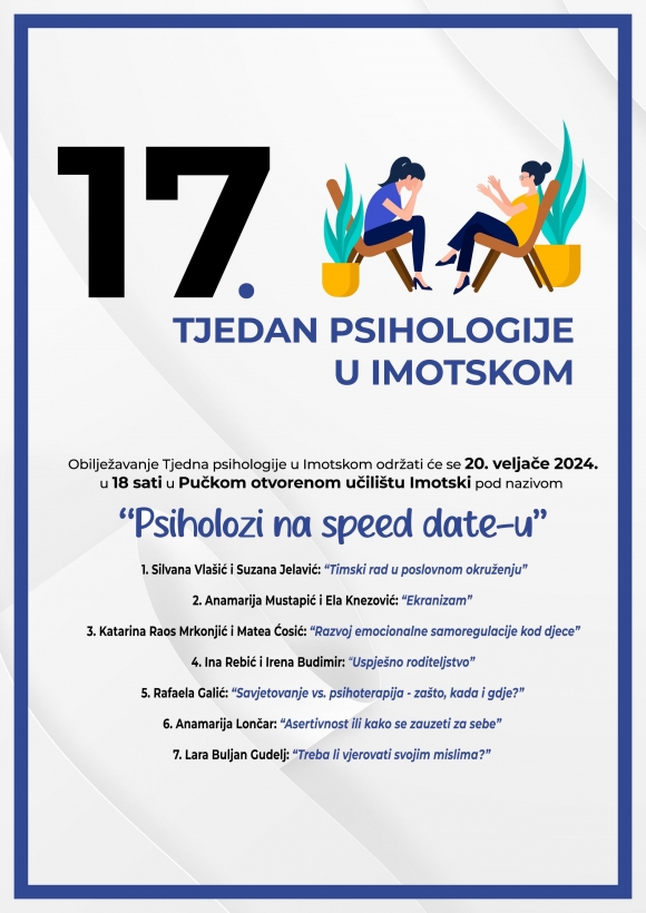 17. Tjedan psihologije u Imotskom - Psiholozi na speed date-u Srijeda, 14 Veljača 2024 10:34 Ispis E-mail Prigodan program 17. Tjedna psihologije priredile se imotske psihologinje na Pučkom otvorenom učilištu u Imotskom. Pročitano1521 puta Objavljeno u Vijesti Vaša ocjena 1 2 3 4 5 (1 glas) Više iz ove kategorije: « 17. tjedan psihologije u labinu 17. tjedan psihologije u labinu» natrag na vrh ▲