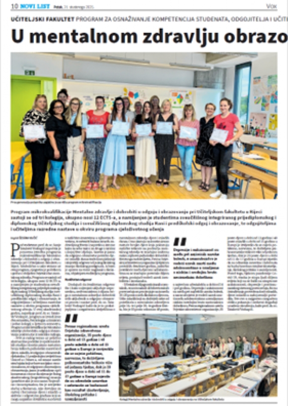 U petak, 10. listopada 2025. godine, započela je ponovna izvedba programa mikrokvalifikacije Mentalno zdravlje i dobrobiti u odgoju i obrazovanju pri Učiteljskom fakultetu u Rijeci, čime je simbolično i obilježen Svjetski dan mentalnog zdravlja. Program se sastoji od tri kolegija, ukupno nosi 12 ECTS-a, a namijenjen je studentima Učiteljskog studija i diplomskog studija Rani i predškolski odgoj i obrazovanje, te odgojiteljima i učiteljima razredne nastave u okviru programa cjeloživotnog učenja. U ak. godini 2025/2026., program se izvodi kroz dva semestra (dva kolegija u zimskom i jedan kolegij u ljetnom semestru). Ovaj program mikrokvalifikacije je 2023. godine pozitivno recenziran od strane stručnjaka u području mentalnog zdravlja i dobrobiti u odgoju i obrazovanju, budući je bio sastavni dio infrastrukturnog projekta razvoja programa mikrokvalifikacije na Učiteljskom fakultetu, te je akreditiran u okviru studijskih programa fakulteta i kao program cjeloživotnog obrazovanja od strane Senata Sveučilišta u Rijeci. Svrha ovog programa je omogućiti polaznicima stjecanje suvremenih znanja i vještina iz područja psihologije dobrobiti, mentalnog zdravlja, socijalno-emocionalnog učenja, otpornosti i suočavanja sa stresom kako u kontekstu profesionalnog razvoja odgojitelja i učitelja, tako i u kontekstu odgojno-obrazovnog rada s djecom rane i predškolske te osnovnoškolske dobi primjenom PROMEHS-kurikula. Dakle, naglasak je na osnaživanju kompetencija iz područja dobrobiti i mentalnog zdravlja odgojitelja i učitelja razredne nastave. Tijekom programa osigurani su svi besplatni materijali (kako nastavni materijali, tako i PROMEHS priručnici) za sve polaznike i studente. U izvedbi programa sudjeluje 12 izvrsnih stručnjaka u području mentalnog zdravlja i dobrobiti u odgoju i obrazovanju.