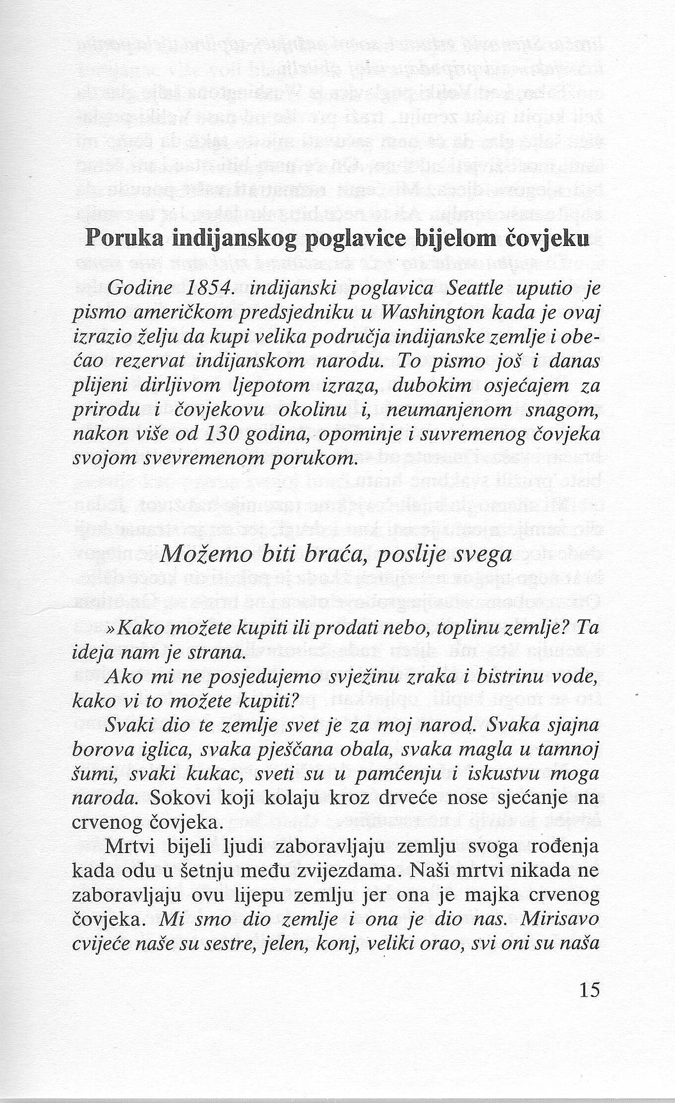 Razmišljajući na koji način simbolički označiti Svjetski dan zaštite okoliša (5.06.) odlučili smo se za pismo koje je indijanski poglavica Seattle uputio američkom predsjedniku. To je pismo Rudi Supek (bivši logoraš iz Buchenwalda, intelektualac zavidne širine te prvi predsjednik Hrvatskog psihološkog društva) stavio kao svojevrsni prolog svoje knjige „Ova jedina Zemlja“, izdane davne 1973.