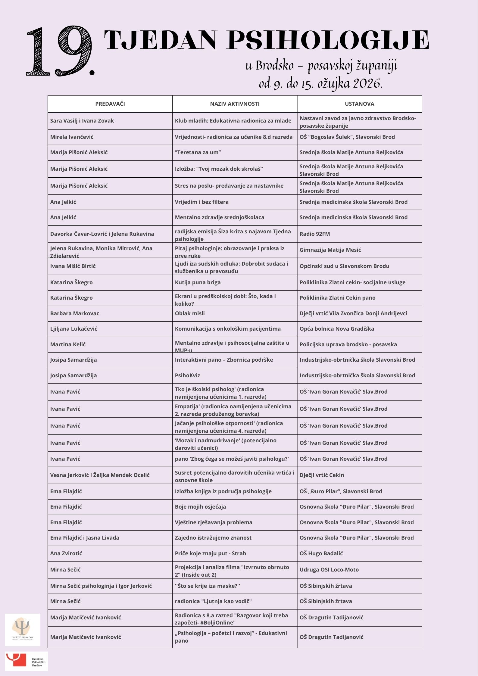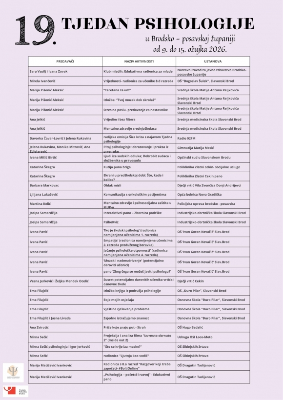 iznimna mi je čast i zadovoljstvo kao predsjednici Društva psihologa Brodsko-posavske županije najaviti Vam 19. Tjedan psihologije u Hrvatskoj koji se ove godine održava od 9.-15. ožujka. Cilj ove manifestacije jest približiti psihologiju široj javnosti te istaknuti važnost psiholoških spoznaja u svakodnevnom životu, obrazovanju, zdravlju i društvu. Kroz niz predavanja, radionica i javnih događaja našim građanima i ove godine pruža se prilika upoznati rad psihologa i saznati kako psihologija može doprinijeti razumijevanju ljudskog ponašanja, očuvanju mentalnog zdravlja i unaprjeđenju kvalitete života.