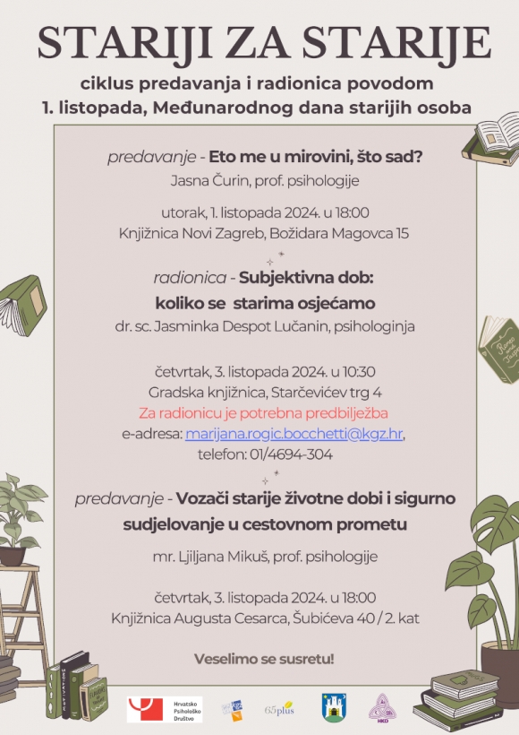 Sekcija Psiholozi u mirovini (PUM-a) Hrvatskog psihološkog društva u suradnji s Knjižnicama grada Zagreba, projekt 65+ , povodom 1. listopada, Međunarodnog dana starijih osoba organizira ciklus javnih predavanja. Često su stariji “generacija u sjeni” iako je, prema svim demografskim pokazateljima 60+ najbrže rastuća dobna kategorija stanovništva. Ovim programom želimo skrenuti pozornost na teme relevantne za starije osobe i njihovu okolinu o kojima se u društvu premalo govori. Smisao programa je i u tome da umirovljeni stručnjaci prenesu dio znanja i profesionalnog iskustva koje posjeduju natrag u zajednicu. Cilj je isti, jačati senzibiliziranje javnosti za pitanja starosti i starenja kao “izazova budućnosti”.