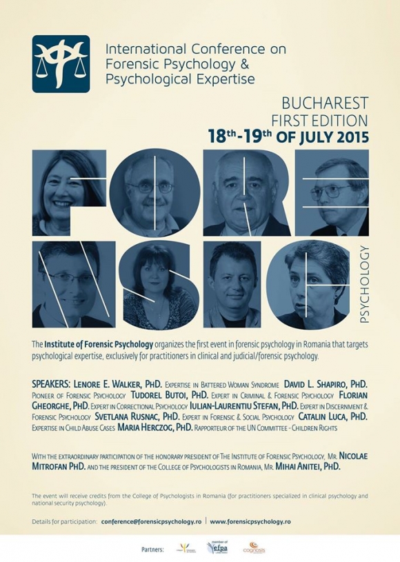 Institut za forenzičnu psihologiju obavještava da će se Međunarodna konferencije forenzične psihologije i psihološke ekspertize održat u Bukureštu, 18. i 19. srpnja 2015. Radi se o prvom skupu ovakvog sadržaja, kako u Rumunjskoj tako i na europskim prostorima. Program je usmjeren na suvremene i aktualne probleme forenzične psihologije i psihološke ekspertize, a na skupu sudjeluju neki od najvećih svjetskih stručnjaka iz ovog područja - dr. David Shapiro, dr. Maria Herzog, dr. Lenor E. Walker i dr. Više obavijesti potražite na priloženoj mrežnoj stranici skupa.