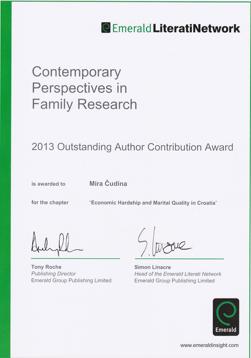Poznata međunarodna izdavačka kuća EMERALD svake godine objavljuje velik broj stručnih knjiga i znanstvenih monografija iz prirodnih, društvenih i humanističkih znanosti na engleskom jeziku. Stručno povjerenstvo za prirodne i društvene i humanističke znanosti ocjenjuje te radove i proglašava najbolju knjigu i najbolje poglavlje u knjizi objavljeno te godine. Obaviješteni smo da je za 2013. godinu stručno povjerenstvo iz društvenih znanosti kao izvanredan doprinos nagradilo poglavlje u zborniku koje su napisali naš član prof. dr. Josip Obradović i profesorica emerita Mira Čudina-Obradović pod nazivom Economic Hardship and Marital Quality in Croatia u zborniku ECONOMIC STRESS AND THE FAMILY. Urednik zbornika je prof. dr. Samson Lee Blair sa sveučilišta The State University of New York, USA.