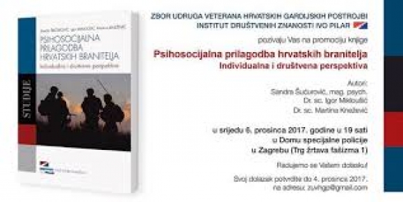 Zbor udruga veterana hrvatskih gardijskih postrojbi i Institut društvenih znanosti Ivo Pilar pozivaju sve zainteresirane na promociju knjige „Psihosocijalna prilagodba hrvatskih branitelja – individualna i društvena perspektiva“.