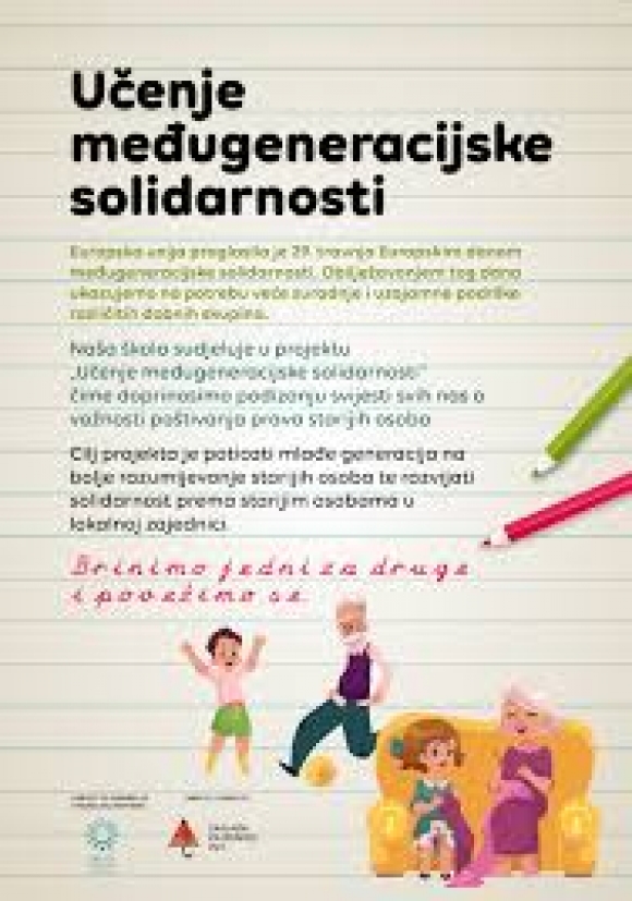 Projekt "Učenje međugeneracijske solidarnosti" provodimo u suradnji s osnovnim školama na području Grada Zagreba. Svrha je praktično učenje djece vrijednostima međugeneracijske solidarnosti kroz razvijanje empatije i brige za starije osobe, osvještavanje stereotipa i predrasuda o starijim osobama te poticanje međugeneracijske integracije i aktivnosti.
