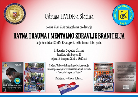 Udruga HVIDR-a Slatina započinje s aktivnostima u okviru projekta „Psihosocijalna prilagodba i prevencija rizičnih ponašanja hrvatskih ratnih vojnih invalida iz Domovinskog rata u Slatini“ koji je razvila u suradnji s psihologom Sinišom Brlasom. Slijedom toga će 02. listopada 2024. godine u 18.30 sati u EPIcentru Sequoia u Slatini (Šetalište Julija Burgera 10) biti održano interaktivno predavanje „Ratna trauma i mentalno zdravlje branitelja“. Predavanje će održati profesor psihologije i specijalist kliničke psihologije Siniša Brlas.