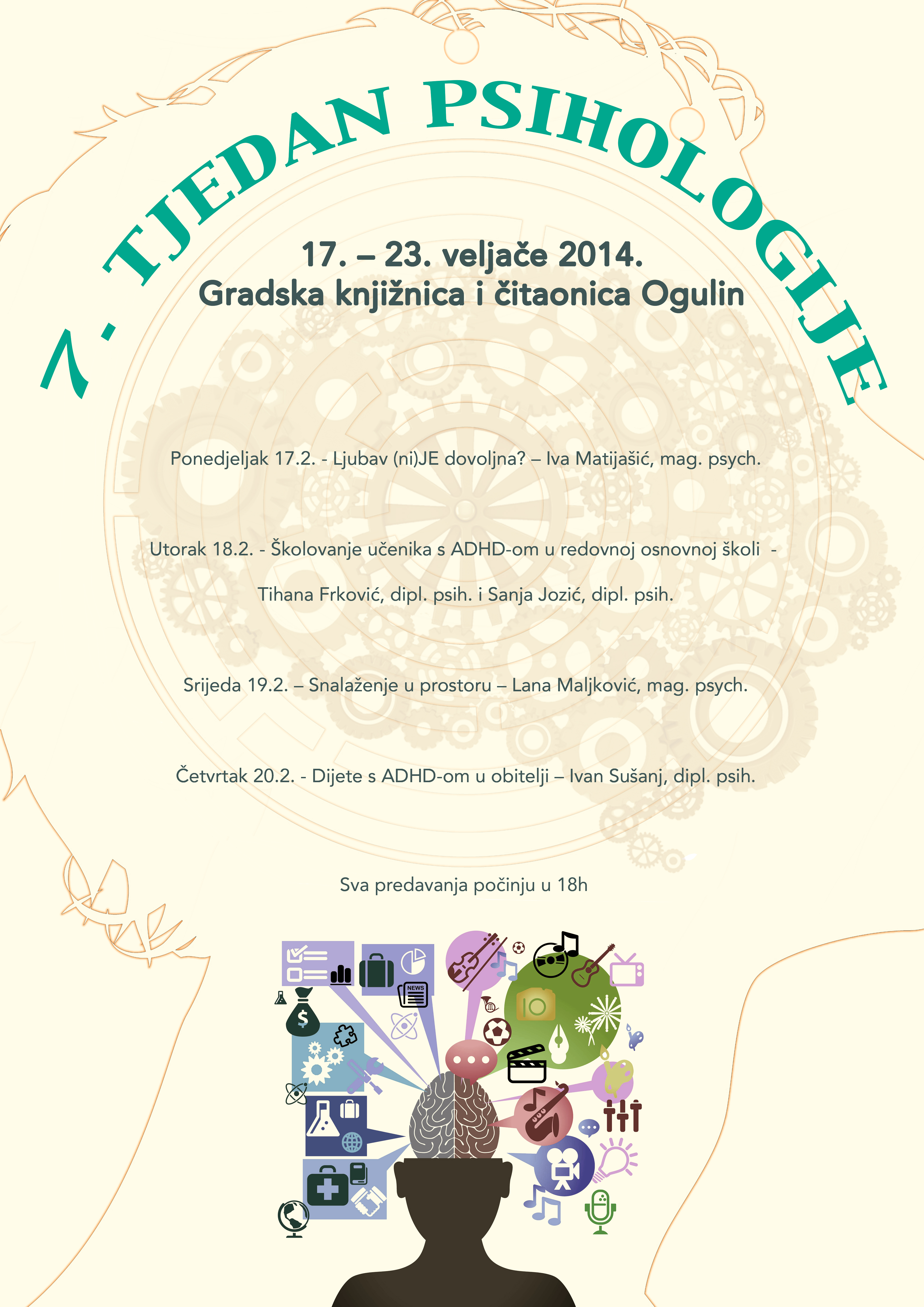 Psiholozi iz Grada Ogulina u 7. tjednu psihologije priređuju niz događanja u Gradskoj knjižnici što su popratili i izradom prigodnog plakata kojeg donosimo u privitku ove vijesti.