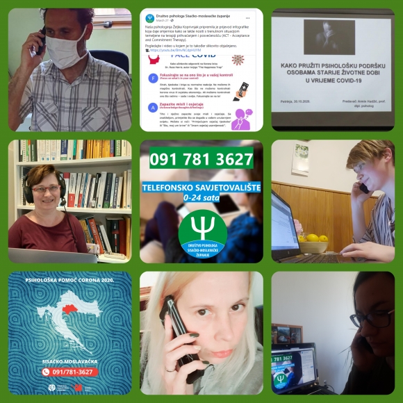 S ciljem skrbi o kvaliteti života, mentalnom/psihičkom zdravlju i psihosocijalnoj potpori svih skupina u zajednici te promidžbe psihologije kao struke Društvo psihologa Sisačko-moslavačke županije se od prvog dana priključilo inicijativi Hrvatske psihološke komore i Hrvatskog psihološkog društva na uspostavljanju mreže linija za telefonsku psihološku pomoć onima koji se nalaze u samoizolaciji ili onima kojima je potrebna stručna pomoć i podrška u nošenju s trenutnom situacijom sa koronavirusom. Koordinator linije bila je Željka Koprivnjak, a volonterke na liniji Bernardica Franjić-Nađ, Marija Petranović, Dragica Treursić Uljanić i Željka Koprivnjak. Linija je od 20.03. do 30.06. bila dostupna svih 24 h i na broj za našu županiju smo zaprimili 40 poziva. U razdoblju od 01.07. do 31.07. linija je bila dostupna od ponedjeljka do petka od 10 do 16 i u tom razdoblju smo zaprimili 7 poziva. Nakon toga više nismo preuzimali dežurstvo, a na upit iz HPK upućen 23.10. vezan uz daljnje uključivanje smo odgovorili negativno budući da nije bilo zainteresiranih volontera. U travnju je za volontere HPK sa Poliklinikom za zaštitu djece i mladih Grada Zagreba organizirala trodnevnu edukaciju (21.-23.04.) a od svibnja je volonterima ponuđeno uključivanje u superviziju.
