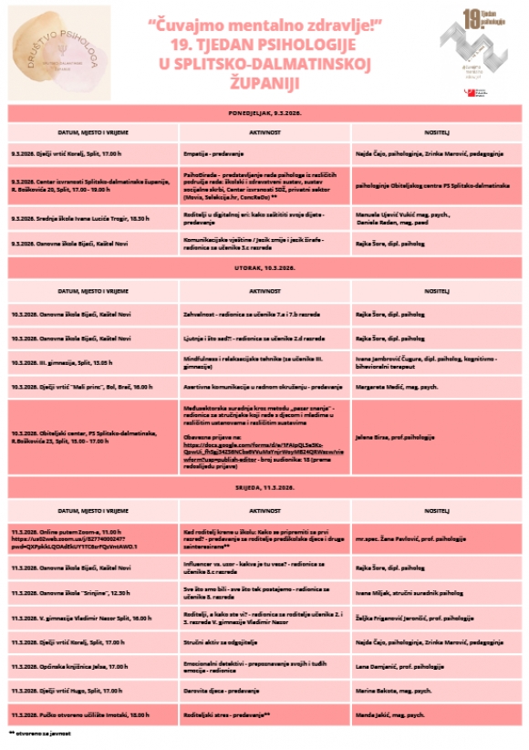 Društvo psihologa Splitsko-dalmatinske županije organizira 19. Tjedan psihologije u Bolu, Imotskom, Jelsi, Kaštel Novom, Kaštel Sućurcu, Solinu, Splitu, Srinjinama i Trogiru.