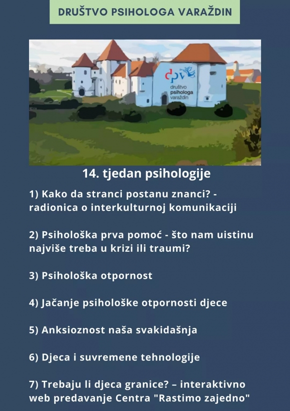 Društvo psihologa Varaždin - program 14. Tjedna psihologije Ponedjeljak, 15 Veljača 2021 22:24 Ispis E-mail Društva psihologa Varaždin obilježit će 14. Tjedan psihologije na način da će održati 7 webinara. U privitku je prigodan plakat. Pročitano4045 puta Objavljeno u DP Varaždin Vaša ocjena 1 2 3 4 5 (1 glas) Više iz ove kategorije: « Telefon za psihološku pomoć u varaždinskoj županiji Telefon za psihološku pomoć u varaždinskoj županiji» natrag na vrh ▲