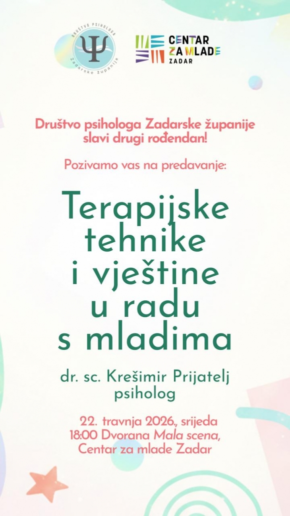 Društvo psihologa Zadarske županije povodom obilježavanja svog drugog rođendana organizira stručno predavanje pod nazivom „Terapijske tehnike i vještine u radu s mladima“, koje će održati psiholog Krešimir Prijatelj.